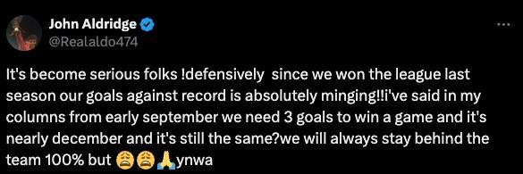 约翰-奥尔德里奇表示:“事情已经变得严重了,各位!自从我们上赛季赢得联赛冠军以来,从防守的角度看,我们的丢球纪录绝对糟糕!”他提到,如今利物浦在联赛中已经丢了20球,这是球队眼下面临的最大问题。